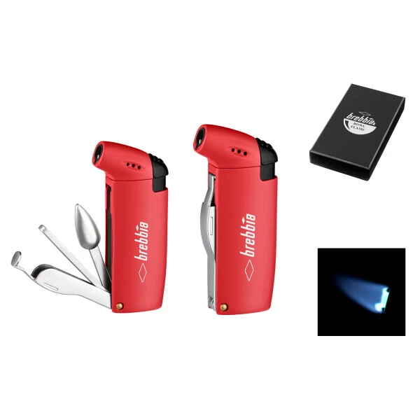 Das Feuerzeug ist in einem lebhaften Rot gehalten, das ihm ein auffälliges und ansprechendes Aussehen verleiht. Das Set enthält auch ein praktisches Besteck, das aus einem Pfeifenreiniger und einem Pfeifenstopfer besteht. Das Besteck ist in einer kleinen Tasche untergebracht, die in das Feuerzeug integriert ist und einfach mitgenommen werden kann.